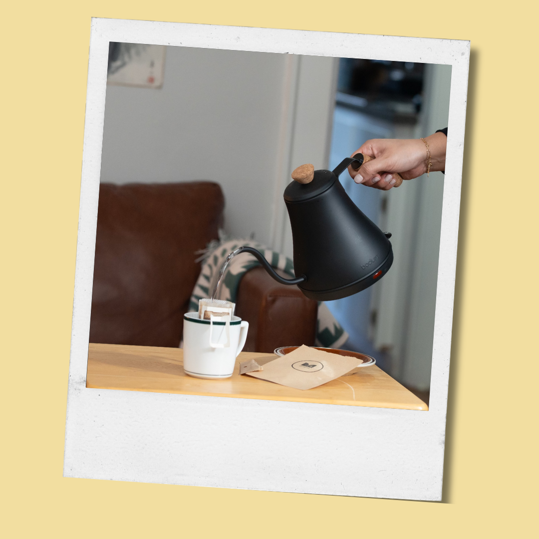 MOJO being poured over by a black goose neck kettle in a home setting.